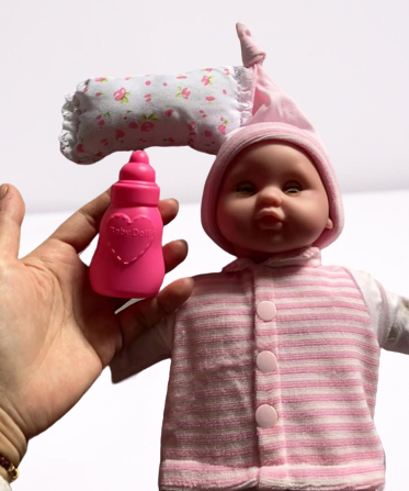 ✅ Combo đầy đủ phụ kiện: gối và bình sữa, bé có thể chơi nhập vai làm mẹ chăm em