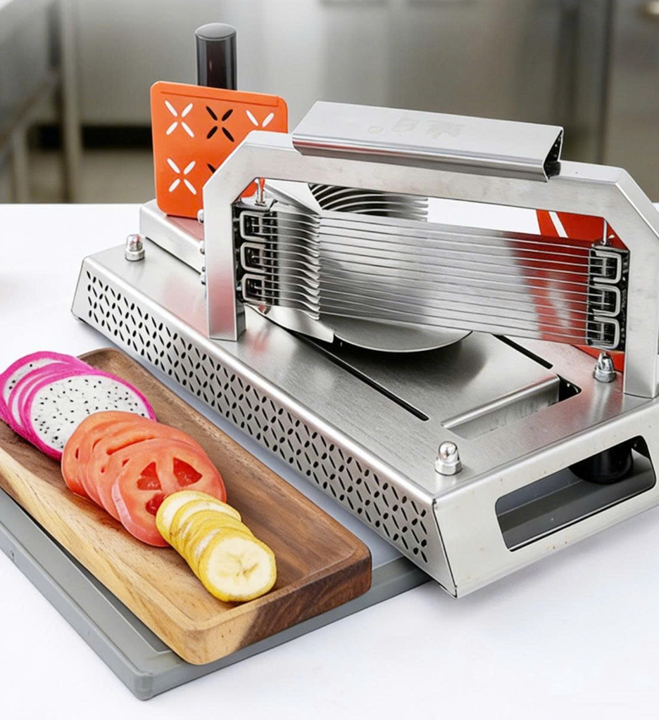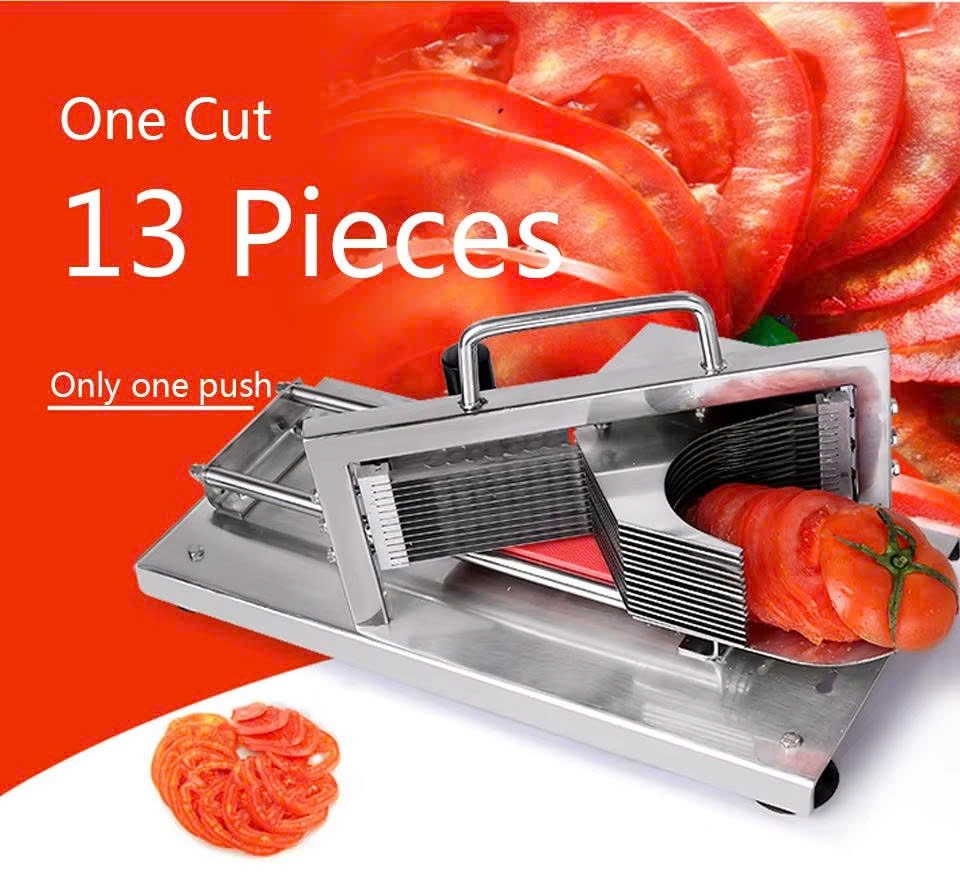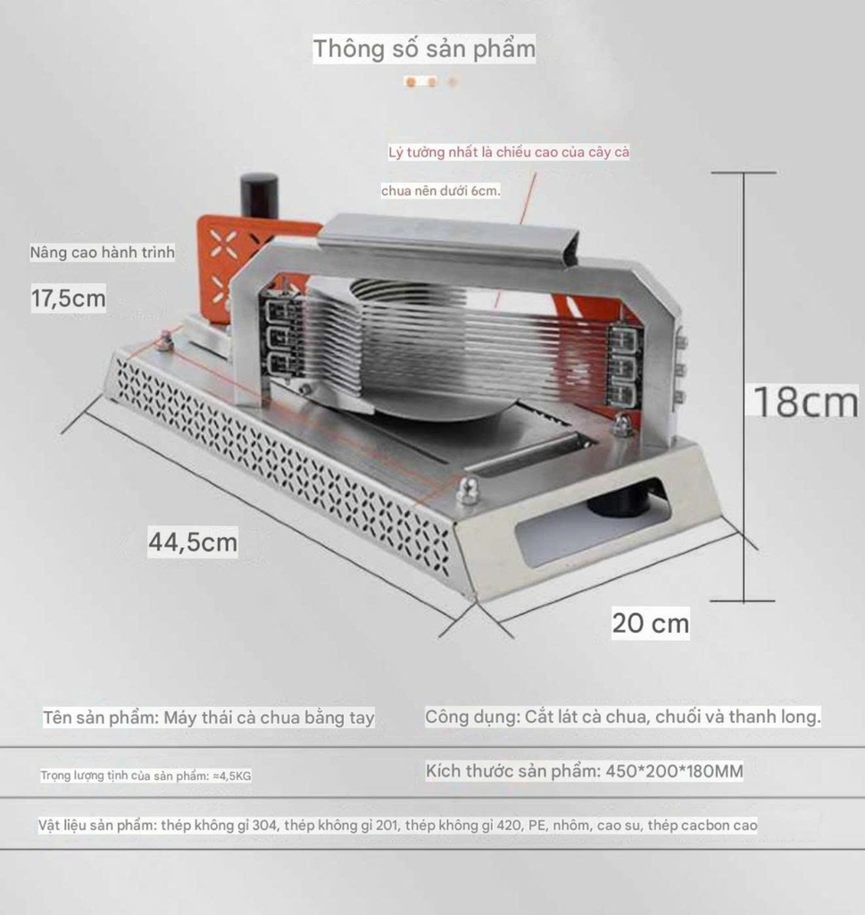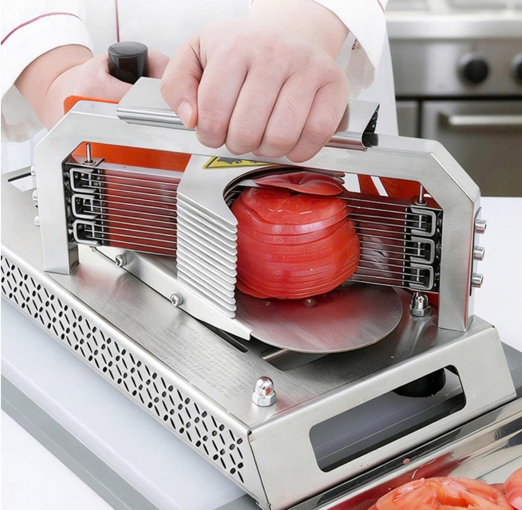 Máy thái cà chua cầm tay được thiết kế chắc chắn với khung inox cao cấp và hệ thống lưỡi dao nhiều lớp giúp cắt lát nhanh, đều và đẹp mắt chỉ với một lần nhấn. Sản phẩm phù hợp cho gia đình, quán ăn, bếp kinh doanh cần sơ chế nhanh số lượng lớn thực phẩm.