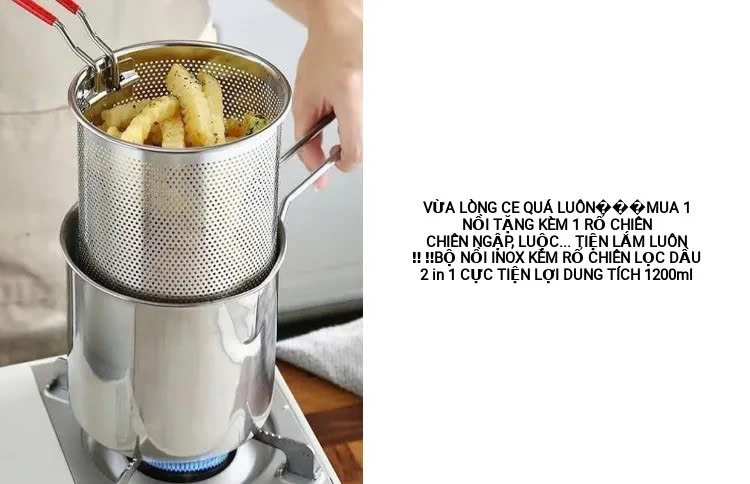 🍟 Bộ Nồi Chiên Ngập Dầu Mini Dáng Dài 2in1 – 1200ml, Inox 304 Cao Cấp